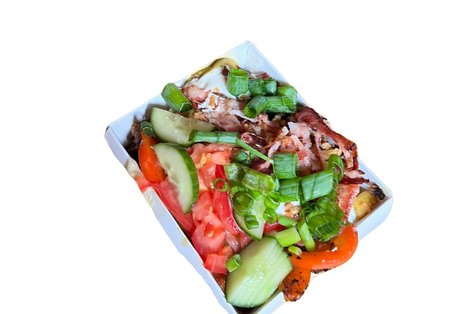 frytki, kebab z karkówki, warzywa grillowane (cukinia,papryka,pieczarki), sos serowy własnej roboty, pomidor, ogórek, szczypiorek, bekon, cebula prażona, cebula, sałata, rukola, roszponka