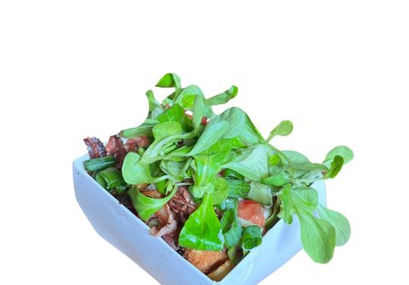 kurczak/hallumi grillowane, ser piórko, roszponka pomidor, ogórek zielony, cebula czerwona w konfiturze, sos jogurtowo-czosnkowy Kcal 550-650/vege 503 B: 55/ vege 28 T: 11/ vege 22 W: 46/ vege 45