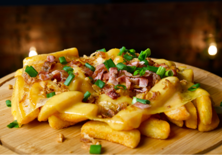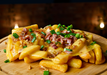 Frytki stekowe zapiekane z serem, bekonem, prażoną cebulką, szczypiorkiem