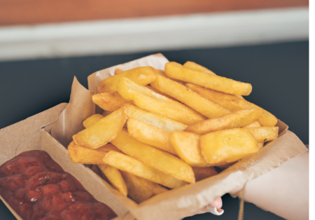 lub na miejscu w postaci małych i dużych frytek (w tym z dodatkami), a ponadto dostarczamy też napoje do