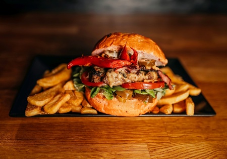 Burger Devil Dragon (Bułka kolorowa, mięso wołowe 150g, sos własny i czosnkowy, cheddar, bekon, cebula czerwona w konfiturze, jalapeno, chilli grillowane, pomidor, roszponka, prażona cebulka) frytki do wyboru