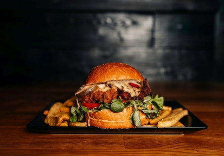Burger Asian Dragon (bułka bao, kurczak panierowany, papryka, ogórek zielony marynowany w sosie sojowym, pomidor, cebula czerwona w konfiturze, roszponka, sezam, sos mayo-gochuchang) frytki do wyboru
