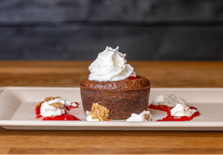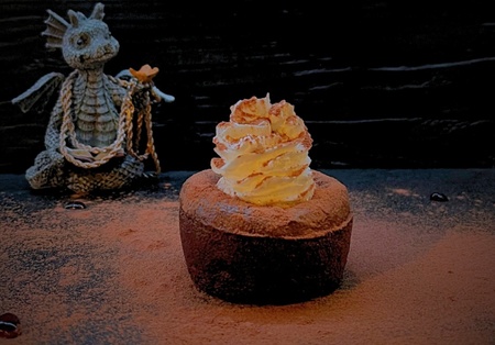 Foundant z bitą śmietaną, konfiturą z wiśni i cynamonem