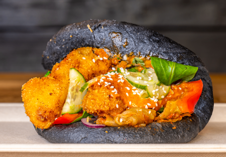bułka bao, kurczak panierowany, papryka, ogórek zielony marynowany w sosie sojowym, pomidor, cebula czerwona w konfiturze, roszponka, sezam, sos mayo-gochuchang