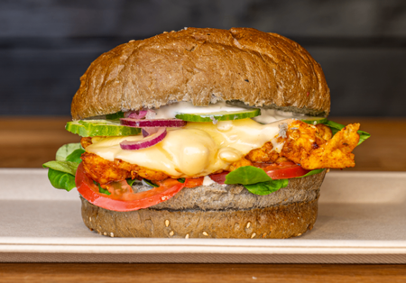 Bułka, filet panierowany, ser cheddar, sos własny i czosnkowy, pomidor, cebula czerwona, ogórek, mix sałat