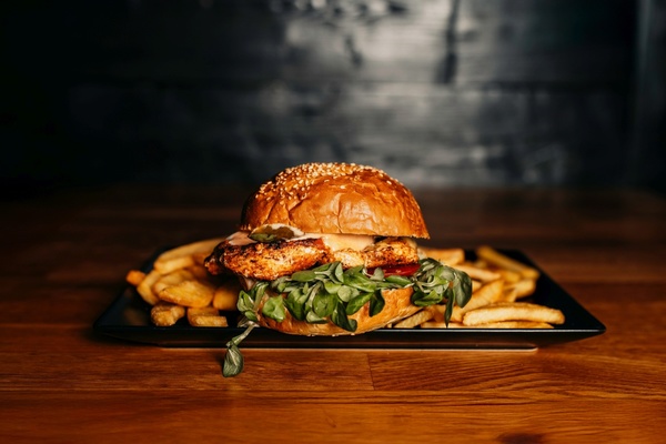 Burger Amaru (Bułka kolorowa, kurczak grillowany , ser cheddar, ogórki kanapkowe, rukola, cebula, pomidor, sos własny, sos czosnkowy), frytki do wyboru