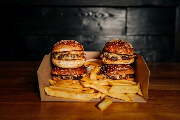 4x Tiny Crushed(bułka, wołowina smash 100g, ser cheddar, sos własny, prażona cebulka, ogórek kiszony) frytki 500g