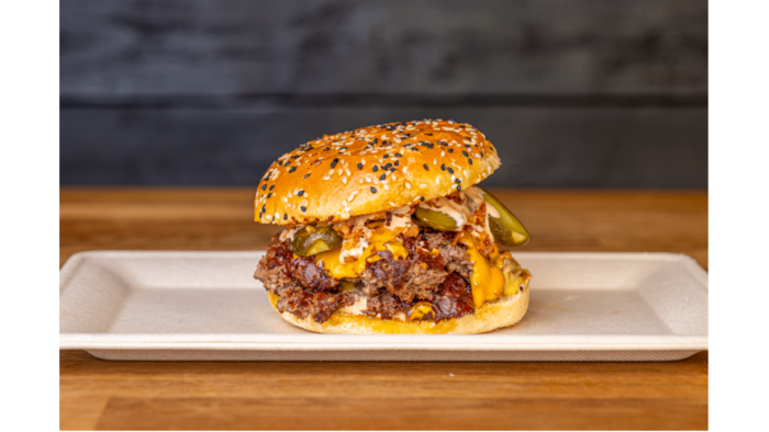 mięso wołowe smash 2x100g, cebula czerwona, ogórek kiszony, ser cheddar i mimolette