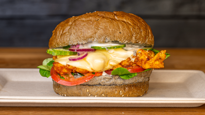 kurczak/hallumi grillowane, ser piórko, roszponka pomidor, ogórek zielony, cebula czerwona w konfiturze, sos jogurtowo-czosnkowy Kcal 550-650/vege 503 B: 55/ vege 28 T: 11/ vege 22 W: 46/ vege 45