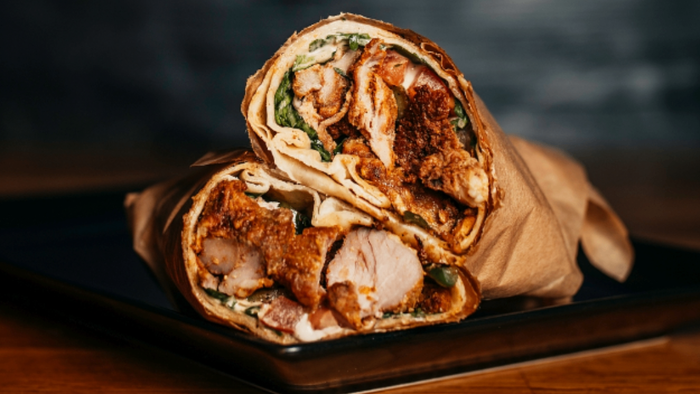 tortilla (30cm), 100g mięsa z kraftowego kebaba z karkówki wieprzowej, rukola, roszponka, pomidor, ogórek, cebula czerwona, warzywa grillowane (papryka, pieczarki, cukinia), sos do wyboru.