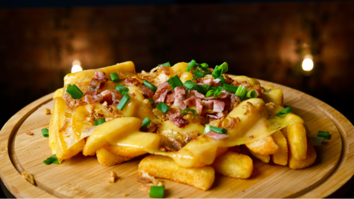 Frytki stekowe zapiekane z serem, bekonem, prażoną cebulką, szczypiorkiem