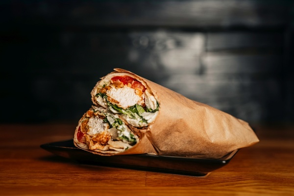 Kurczak w panierce, ser cheddar, tortilla, pomidor, cebula, ogórek, mix sałat, sos