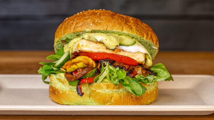 sos bazyliowy, ogórek zielony, hallumi lub klotlet vege warzywa grillowane, roszponka, sos jogurtowo-czosnkowy