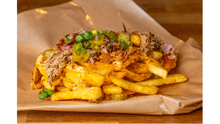frytki, ser cheddar, bekon, jalapeno, szarpana wieprzowina, szczypiorek, prażona cebulka