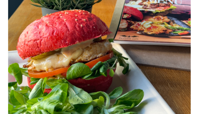Bułka, kurczak grillowany lub panierowany , ser cheddar, ogórki kanapkowe, rukola, cebula, pomidor, sos własny, sos czosnkowy