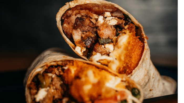 tortilla (30cm), 100g mięsa z kraftowego kebaba z karkówki wieprzowej, ser panierowany, boczek, rukola, roszponka, pomidor, ogórek, cebula czerwona, warzywa grillowane (papryka, pieczarki, cukinia), sos do wyboru
