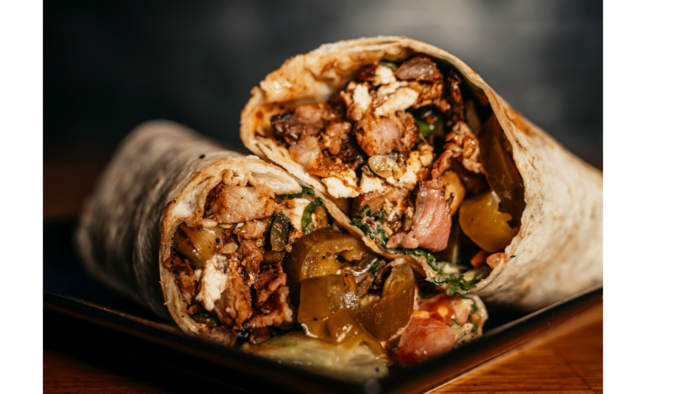 tortilla (30cm), 100g mięsa z kraftowego kebaba z karkówki wieprzowej, boczek, papryka jalapeno, rukola, roszponka, pomidor, ogórek, cebula czerwona, warzywa grillowane (papryka, pieczarki, cukinia), sos do wyboru